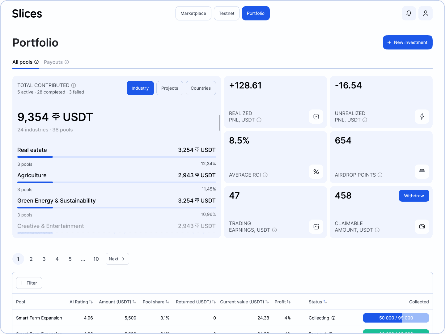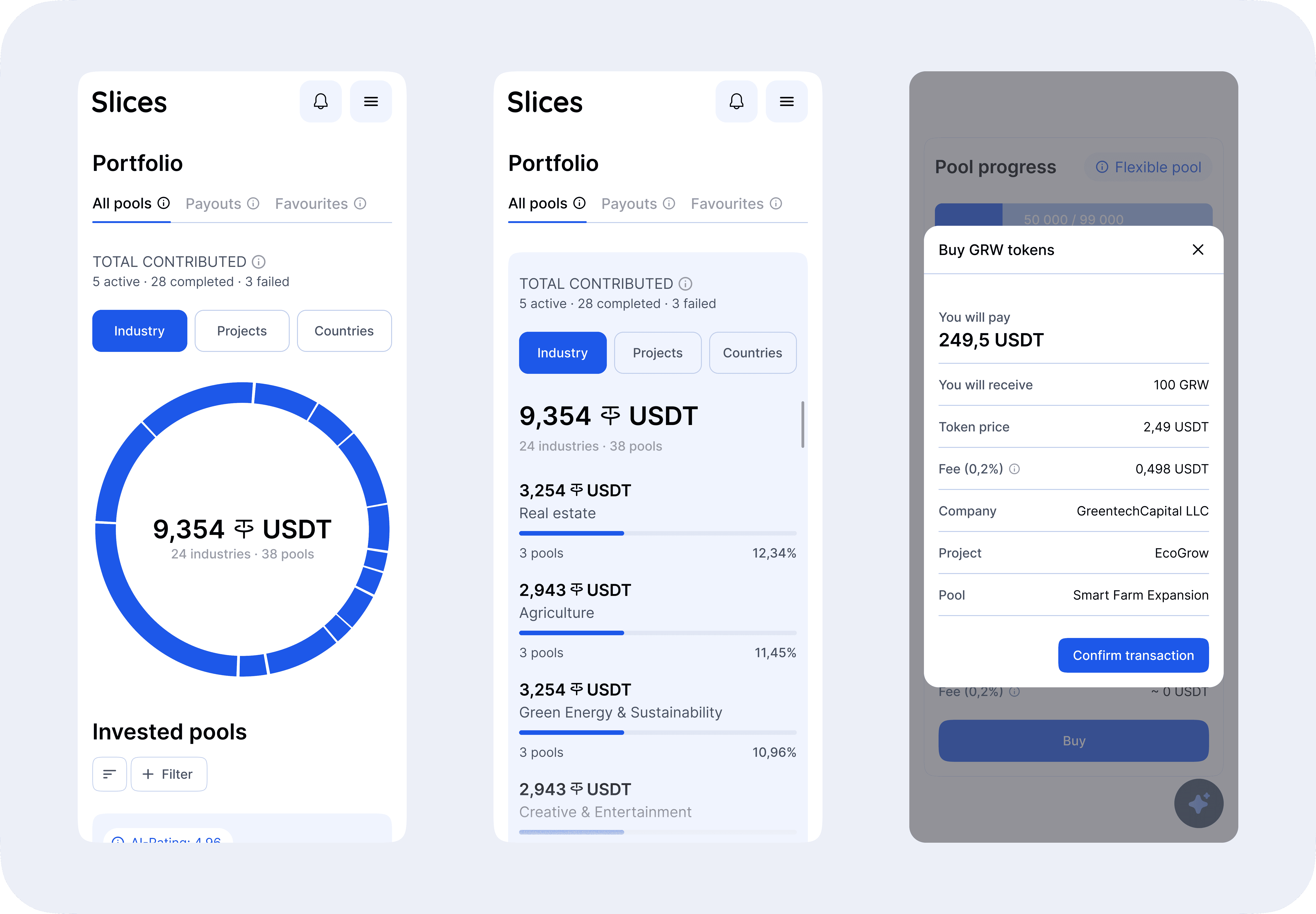 Slices — инвестиционная платформа для криптоинвесторов и овнеров физических бизнесов (кафе, сеть магазинов или строительная корпорация). Сервис позволяет эффективно собирать деньги на нужды бизнеса и делать ощутимо выгодные инвестиции на базе личного уникального блокчейна, с помощью криптовалюты. К проекту я присоединился в роли ключевого продуктового дизайнера под руководством арт-директора уже после итерации работ UX-редакторов и прототипировщиков.