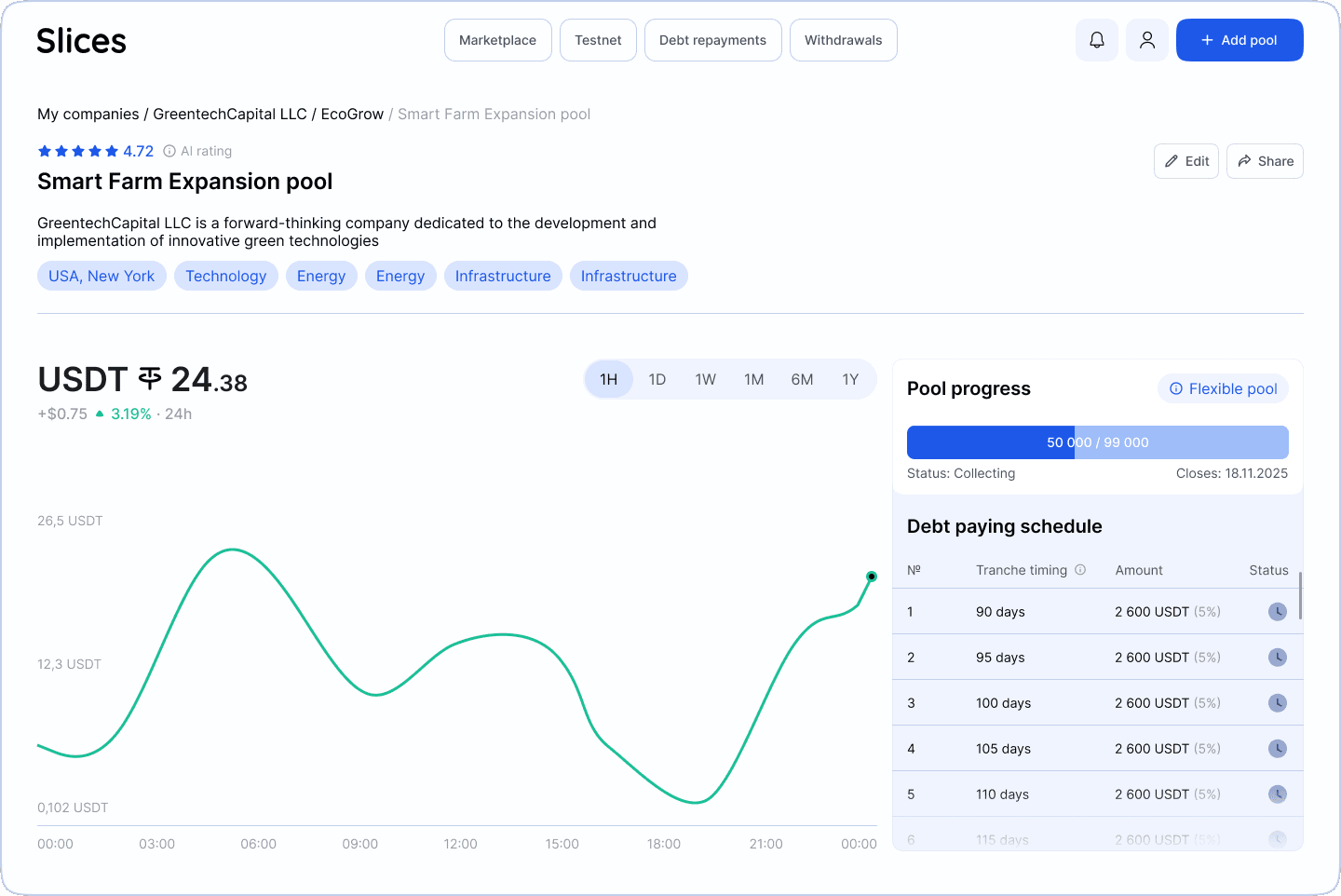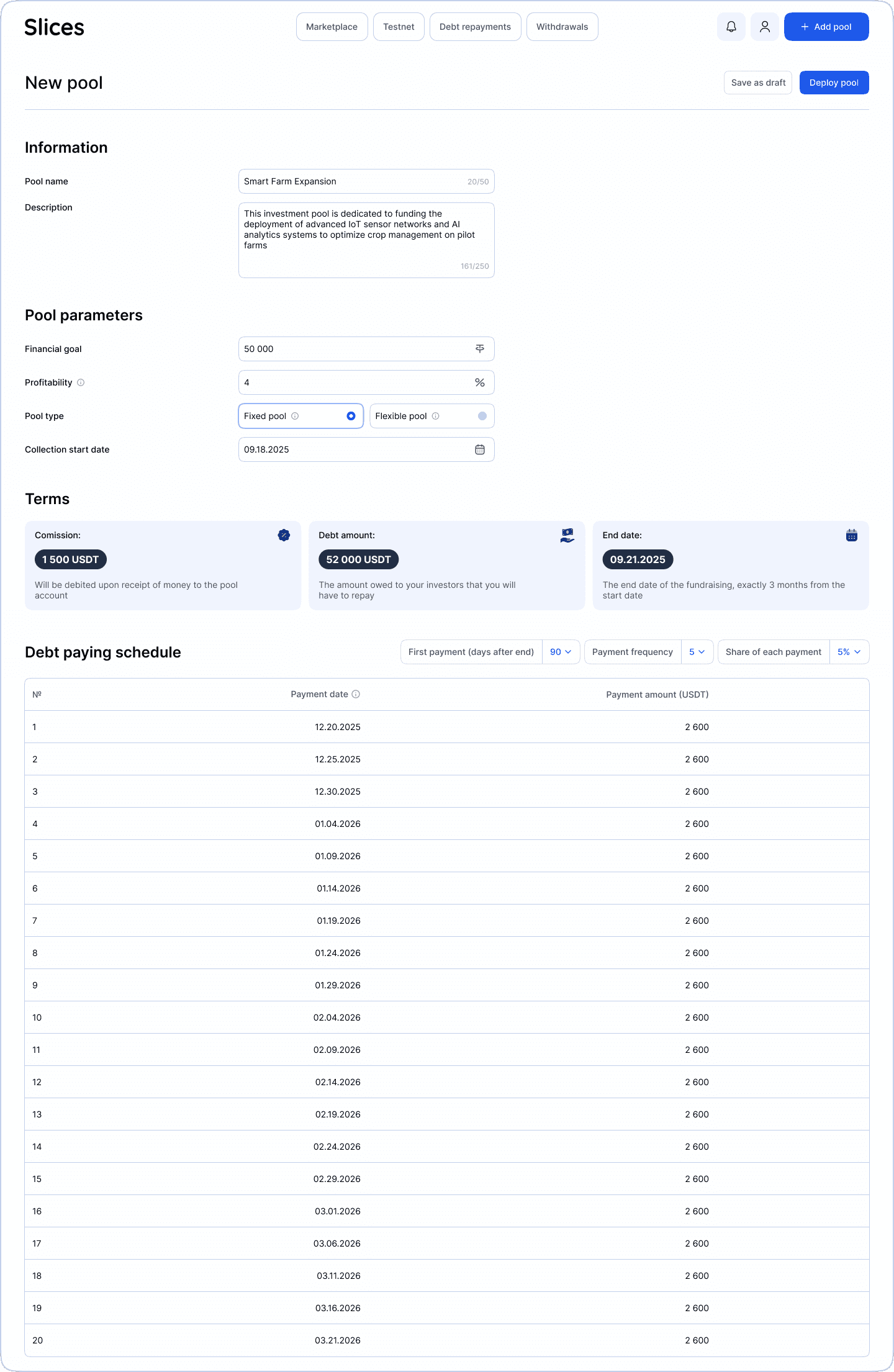 Дату платежа мы рассчитываем автоматически, так как вообще-то у системы уже есть все вводные для этого. Но, бережно напоминаем в тултипе, что в внеплановых ситуациях они могут двигаться (например, если пул имеет фиксированный тип и собрал инвестиции слишком быстро).