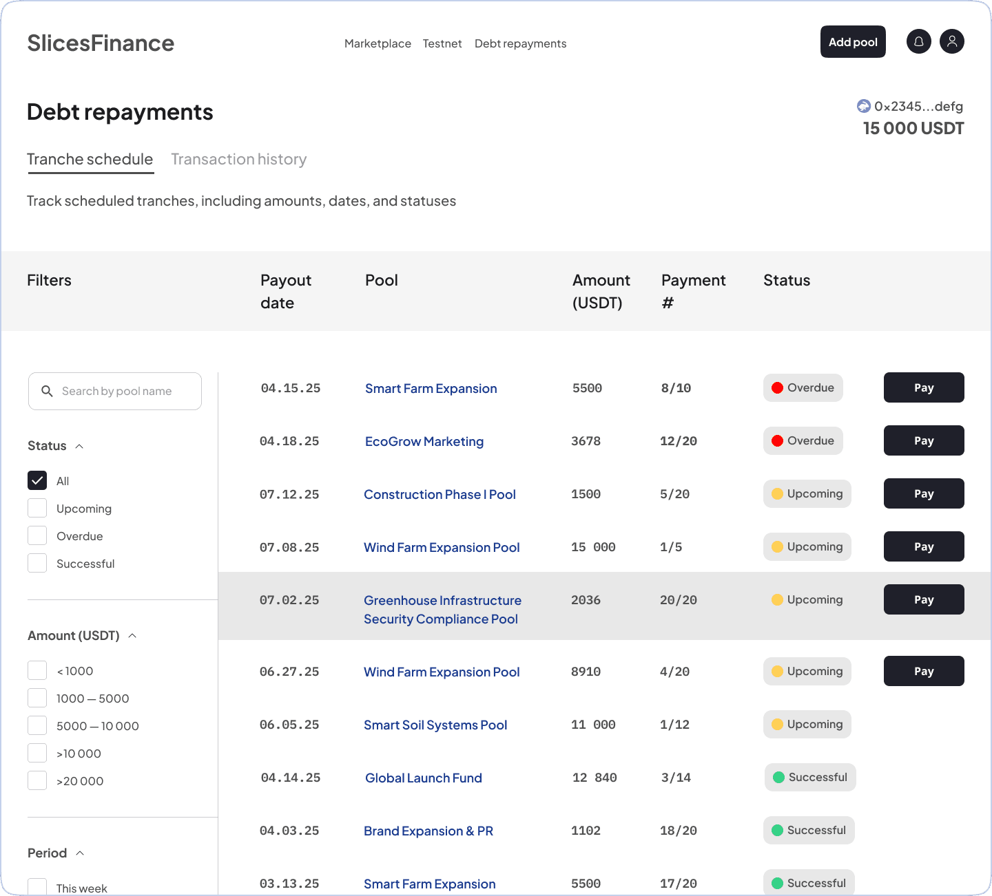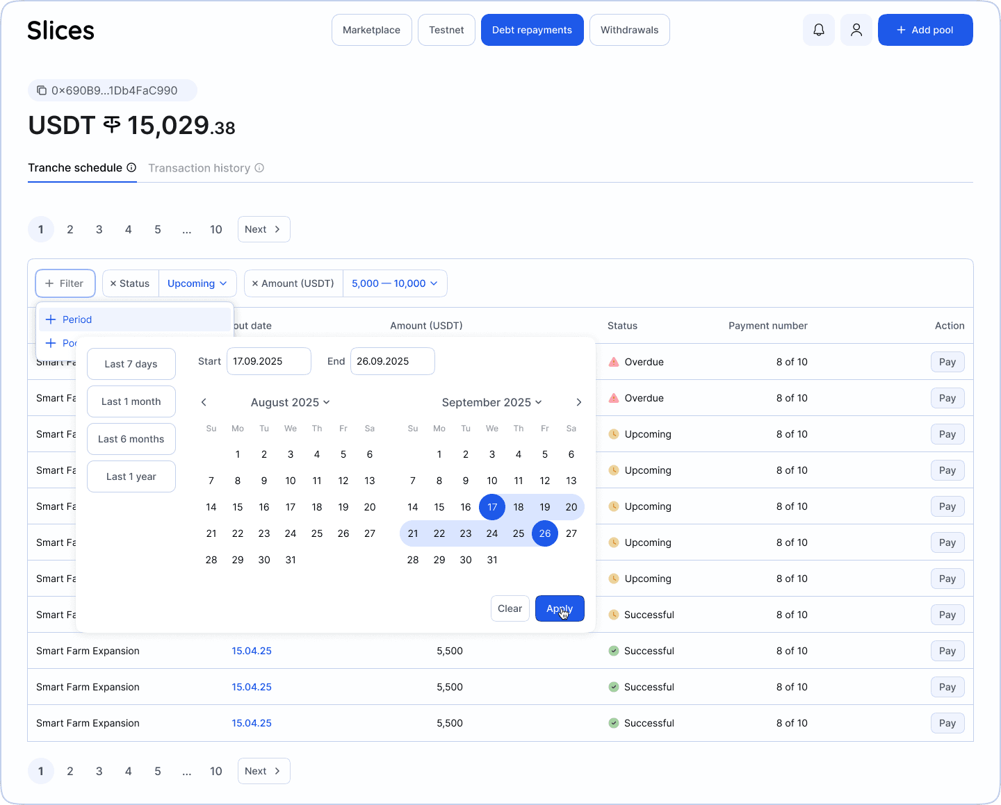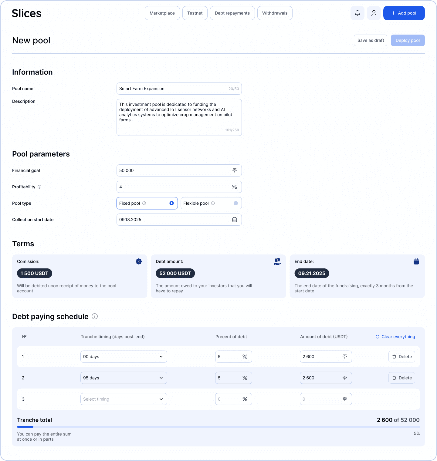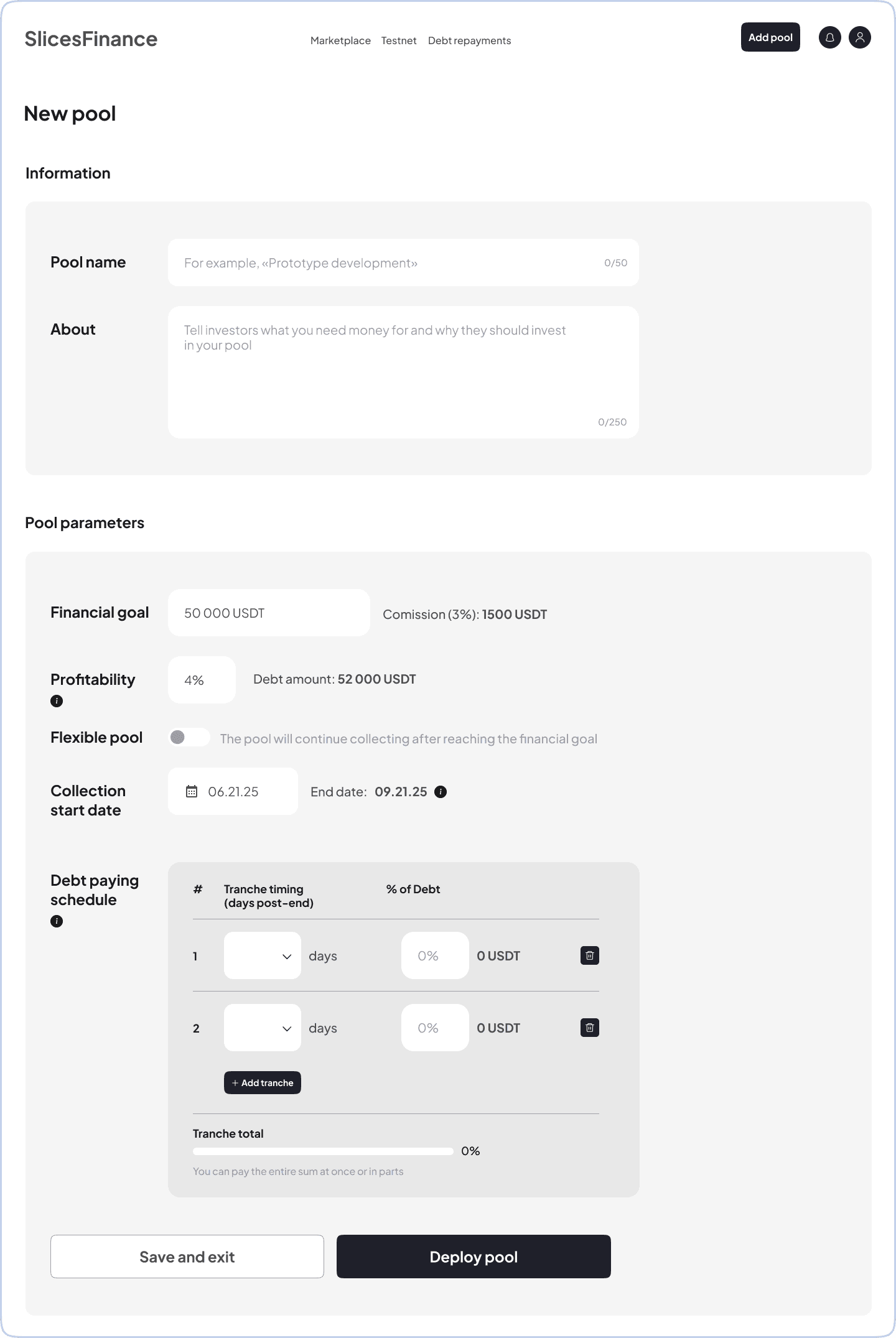 Пользователям, как минимум, не придется постоянно кликать на Add tranche: система сама определяет, что сумму долга овнер своими платежами ещё не исчерпал, и поэтому каждый раз добавляет новую обязательную строку на заполнение.